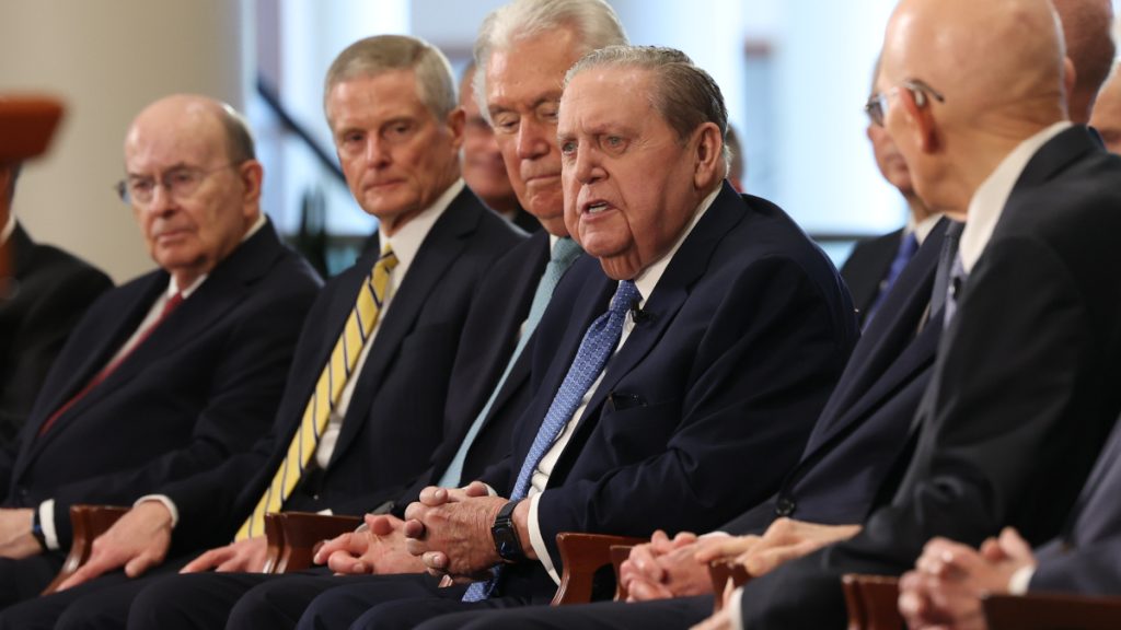 President Jeffrey R. Holland, President of the Quorum of the Twelve Apostles of The Church of Jesus Christ of Latter-day Saints, during a broadcast announcing the new First Presidency at the Conference Center in Salt Lake City, Utah, on Tuesday, October 14, 2025. 2025 by Intellectual Reserve, Inc. All rights reserved.